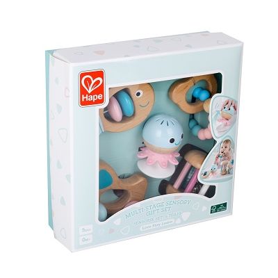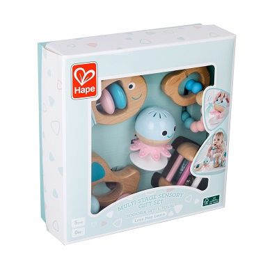 Aceasta colectie minunata de 5 jucarii creste odata cu micutii tai si ajuta la dezvoltarea lor la fiecare pas. Setul contine o zornaitoare in forma de caracatita cu ventuza ce se poate prinde pe masa o zornaitoare rotativa o jucarie de dentitie cu margele pentru bebelusi o zornaitoare in forma de peste si un catelus pe roti. Acest set este perfect perfect pentru dezvoltarea senzoriala incurajand coordonarea ochi-mana abilitatile motorii fine si dezvoltarea muschilor. Zornaitoarele sunt de asemenea un instrument excelent pentru dezvoltarea timpurie a constientizarii auditive. Jucariile sunt realizate din lemn folosind materiale ecologice vopsite in culori atragatoare cu vopsele nontoxice care depasesc cele mai inalte si stricte standarde internationale de siguranta si calitate precum EN71 ISO9001 ASTM F963 si altele. De multi ani Hape a creat jucarii fantastice de inalta calitate folosind materiale ecologice si durabile fiecare produs fiind atent proiectat pentru a stimula abilitatile senzoriale fizice si emotionale. Atentie Nu lasati ambalajele jucariilor produselor la indemana copiilor. Indepartati orice ambalaj al jucariei produsului inainte de a da jucaria produsul copilului. Va rugam sa supravegheati copilul in timp ce se joaca foloseste acest produs. Pastrati instructiunile si etichetele pentru referinte viitoare. Pastrati jucaria produsul departe de foc feriti jucaria produsul de temperaturi ridicate si umiditate.Specificatii