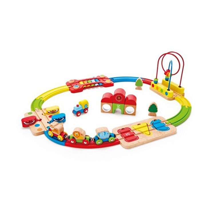 Include piesa de xilofon care reda un ton pe masura ce un tren circula Tamburina urmeaza ritmul in timp ce trenurile trec. Include tren cu tematica jungla cu vagoane de tigru, leu si elefant Blocurile optice includ functii de oglinda, prisma si lupa. Compatibil cu majoritatea celorlalte seturi de sine din lemn.