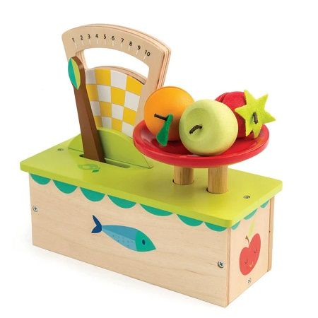 Cantar - Weighing Scales din lemn premium. Cantareste-ti fructele si legumele din lemn cu acest cantar functional viu colorat. Fructul se desface pentru a-i invata pe copii despre fractii si greutate. Ajuta la dezvoltarea conceptului preliminar despre numere si greutate si promoveaza jocul de rol imaginativ i creativ. Contine 4 piese. Promovarea distractiei sanatoase si pozitive - Situatiile din viata reala ii inspira pe copii sa gandeasca creativ in timpul copalariei si ii determina sa interactioneze mai usor cu ceilalti in acelasi timp construind incredere si prietenie. De asemenea le consolideaza limbajul emotiile si abilitatile motrice fine. O metoda buna de dezvoltare a procesului de gandire - Copiii vor invata sa gandeasca pas cu pas si sa cultive bune obiceiuri organizationale in timp ce indeplinesc sarcini. Incurajeaza interactiunea cu parintii si fratii pentru a rezolva problemele si a-si indeplini obiectivele. Recomandat copiilor cu varsta de peste 3 ani. Jocurile premium creeaza un mediu de joc natural - Tender Leaf Toys foloseste cunostintele si creativitatea pentru a aduce energie si emotie jucariilor realizate din lemn premium. Din dorinta de a proteja pamantul folosesc doar lemn ecologic. Realizat dintr-o resursa regenerabila - Va doriti ce-i mai bun pentru copilul dumneavoastra si aceasta jucarie chiar acest lucru livreaza. Fabricat din lemn de arbore din cauciuc regenerabil aceasta este o jucarie ecologica si sigura care nu contine substante chimice iar pentru fiecare copac care devine o jucarie frumoasa un altul este replantat. Vopseaua folosita este pe baza de apa non-toxica pentru a pastra copii in siguranta. Indeplineste toate standardele de siguranta si calitate europene - Calitatea si siguranta sunt cele mai importante parti ale proiectelor de la Tender Leaf Toys. Fiecare jucarie este facuta cu grija pentru bunastarea si educatia copiilor. Proiectat de echipa TLT din Marea Britanie pentru a satisface toate standardele europene. Fabricat in fabrica TLT din Indonezia. Despre Tender Leaf Toys creeaza jucarii netede frumos proiectate care promoveaza invatarea prin joc. Traditionali in conceptie dar contemporani in design toate produsele sunt realizate cu un accent distinct pe mestesug si calitate.Specificatii