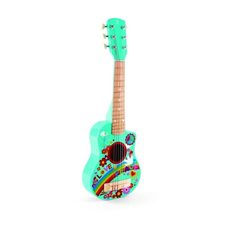 Explorati sunetele produse prin zvacnirea fiecareia dintre cele sase corzi ale chitarei separat si impreuna. Folositi instructiunile pentru a afla elementele de baza ale cantarii la chitara. Cu practica, veti imbunatati si veti incepe sa cantati melodii reale. Chitara cu tematica anilor 1960. Corzile din nailon sunt blande si fixate corespunzator pe suprafata de lemn pentru a proteja mainile copiilor Chitara poate fi reglata cu precizie si produce un sunet de inalta calitate. Excelent pentru introducerea copiilor in bucuria muzicii.
