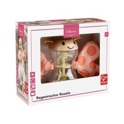 Fluturasul Rosalie ofera celor mici functii interesante precum simtul tactil atingand amestecul de materiale din material textil lemn si plastic Il face extrem de usor de tinut in mana Perlele care picura amintesc de ploaie. Rosalie poate fi de asemenea folosit ca o jucarie care face zgomot iar aripile sale pot fi indepartate si spalate. Jucariile sunt realizate din lemn folosind materiale ecologice vopsite in culori atragatoare cu vopsele nontoxice care depasesc cele mai inalte si stricte standarde internationale de siguranta si calitate precum EN71 ISO9001 ASTM F963 si altele. De multi ani Hape a creat jucarii fantastice de inalta calitate folosind materiale ecologice si durabile fiecare produs fiind atent proiectat pentru a stimula abilitatile senzoriale fizice si emotionale. Atentie Nu lasati ambalajele jucariilor produselor la indemana copiilor. Indepartati orice ambalaj al jucariei produsului inainte de a da jucaria produsul copilului. Va rugam sa supravegheati copilul in timp ce se joaca foloseste acest produs. Pastrati instructiunile si etichetele pentru referinte viitoare. Pastrati jucaria produsul departe de foc feriti jucaria produsul de temperaturi ridicate si umiditate.Specificatii