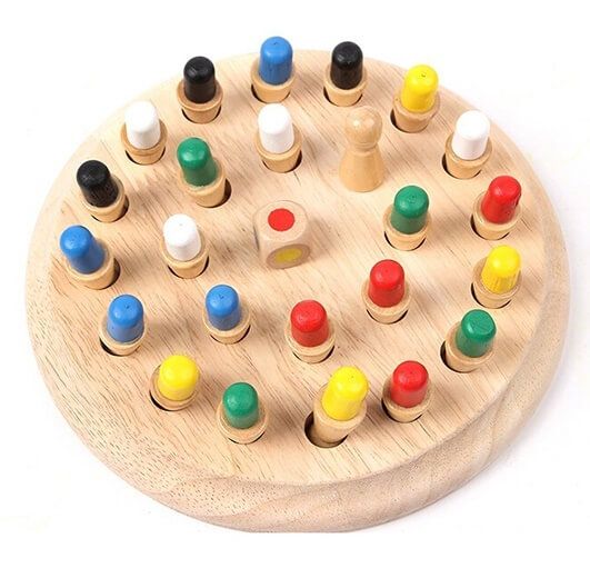 Plasati toti pionii din lemn pe tabla de joc. Pionii au aspect identic singura diferenta fiind baza de culoare diferita. Baza se insereaza in plansa suport nefiind vizibila odata introdusa. Aruncati zarul si in functie de culoarea aratata de zar trebuie sa ridicati un pion de aceeasi culoare. Daca ati nimerit pion cu baza de aceeasi culoare cu cea de pe zar pastrati pionul. In caz contrar pionul se plaseaza inapoi in plansa suport si jocul continua. Cine strange cei mai multi pioni castiga Jocul de memorie antreneaza memoria vizuala fiind si foarte distractiv. Diametru aproximativ 17 cm Continut 1 x tabla de joc de sah 1 x zaruri 24 x piese de sah colorate Nota Aceasta jucarie nu este destinata copiilor sub 3 ani. Datorita masurarii manuale pot exista erori de dimensiuni de 1-2 mm.Specificatii