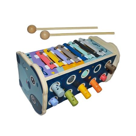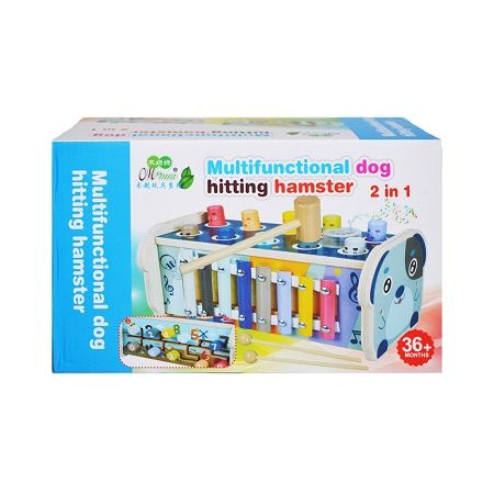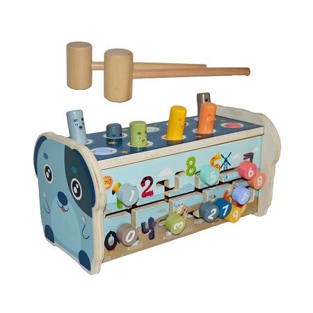 Jucaria 2 in 1 combina mai multe tipuri de jocuri pentru copii intr-unul singur joc cu ciocanul xilofon si potrivirea numerelor in labirint Aceste jocuri distractive ii vor atrage pe copii mult timp si nu se vor plictisi. Caracteristici - Jucaria este confectionata din lemn natur si are capetele imprimate cu un simpatic catelus. - Setul contine bancul de activitati 2 bete pentru cantat la xiloton si 2 ciocanele. - Bancul are 3 fete cu activitati difetite pe o fata este un xilofon multicolor pe o alta este un joc de lovire cu ciocanul iar pe a treia fata este un labirint numeric. - Xilofonul are 8 lame din metal in culori pastel care emit 8 note ajutand la dezvoltarea auzului copiilor. - Copiii se distreaza de minune lovind cu ciocanelul din lemn coloanele saritoare. Cand o coloana este lovita ea se aseaza in banc iar cea din dreptul ei se ridica datorita mecanismului special tip pargie care face ca jucaria sa nu se blocheze. - Pe cea de-a treia fata a jucariei copiii trebuie sa duca piesele mobile numerotate ale labirintului la locul fiecareia permitandu-le sa invete cifrele. - Aceasta jucarie din lemn stimuleaza motricitatea coordonarea ochi-mana orientarea spatiala precum si dezvoltarea simtului auditiv. - Jucaria este ambalata in cutie din carton. Dimensiune jucarie 25x14x15 cm Avertizare Produsul este nou si comercializat in ambalajul original al producatorului. Imaginile de pe site au caracter informativ. Nuanta tonul si intensitatea culorii pot varia in functie de monitor. Ambalajul trebuie indepartat recuperat si aruncat de catre un adult inainte de a se da spre utilizare copilului. Nu lasati ambalajele produselor la indemana copiilor. Se recomanda utilizarea produsului sub supravegherea unui adult. Produsul poate contine piese mici care se pot inghiti sau inhala de cei mici existand pericolul de sufocare sau nu este potrivita copiilor mai mici de 3 ani. Pastrati instructiunile si etichetele pentru referinte viitoare. Pastrati produsul departe de foc si nu il lasati in preajma temperaturilor ridicate si a umiditatii. Datorita masurarii manuale a produsului poate exista o diferenta minora fata de dimensiunea reala a produsului.Specificatii