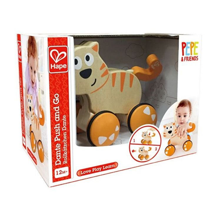 Pisicii Dante ii place sa se plimbe cu prietenii sai. Apasati usor pe spate si priviti-l rostogolindu-se inainte, dand din coada. Plasati-l pe Dante pe o suprafata plana, precum podeaua. Apasati usor in jos si el se rostogoleste inainte. Jucarie din lemn impingeti si mergeti. Personaj dragut de pisica. Mecanismul inteligent intern propulseaza jucaria inainte cand spatele sau este impins in jos si eliberat. Coada se misca atunci cand pisica se misca inainte.