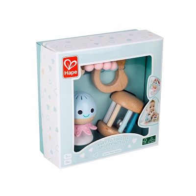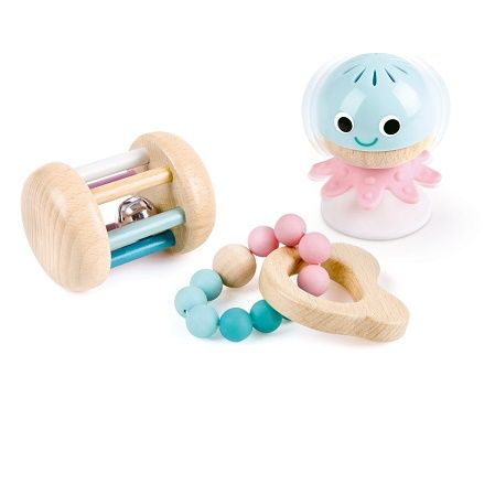 Aceasta colectie minunata de 3 jucarii creste odata cu micutii tai si ajuta la dezvoltarea lor la fiecare pas. Setul contine o zornaitoare in forma de caracatita cu ventuza ce se poate prinde pe masa o zornaitoare rotativa si o jucarie de dentitie cu margele pentru bebelusi. Acest set este perfect perfect pentru dezvoltarea senzoriala incurajand coordonarea ochi-mana abilitatile motorii fine si dezvoltarea muschilor. Zornaitoarele sunt de asemenea un instrument excelent pentru dezvoltarea timpurie a constientizarii auditive. Jucariile sunt realizate din lemn folosind materiale ecologice vopsite in culori atragatoare cu vopsele nontoxice care depasesc cele mai inalte si stricte standarde internationale de siguranta si calitate precum EN71 ISO9001 ASTM F963 si altele. De multi ani Hape a creat jucarii fantastice de inalta calitate folosind materiale ecologice si durabile fiecare produs fiind atent proiectat pentru a stimula abilitatile senzoriale fizice si emotionale.Specificatii