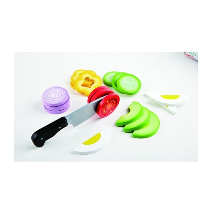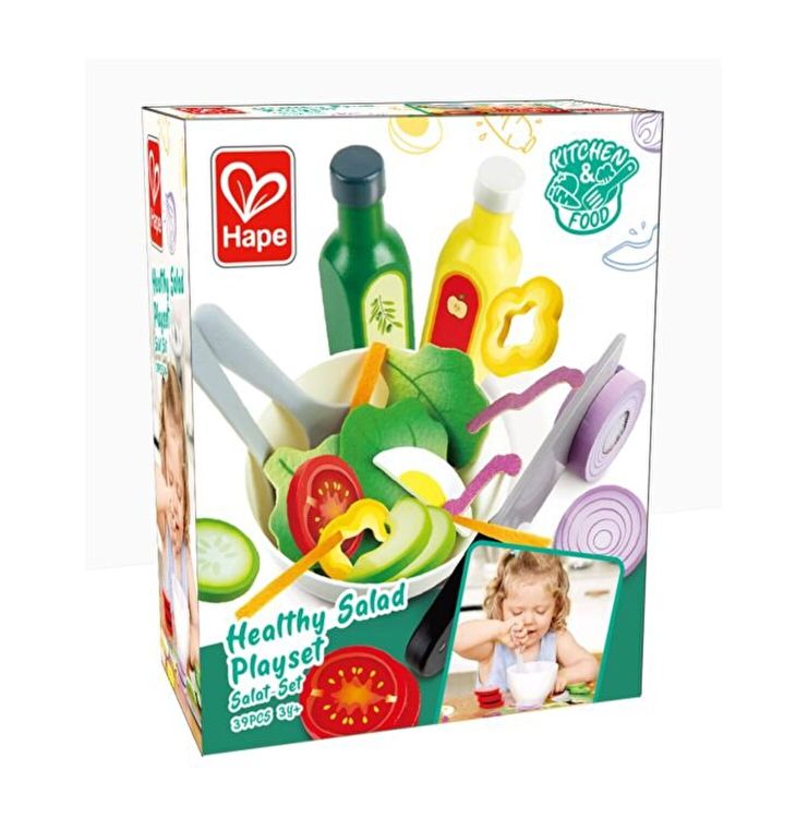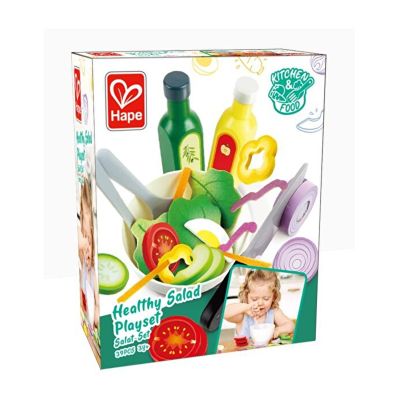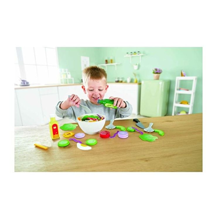 Pregatiti o masa sanatoasa cu acest fantastic set de salata! Include bucati de ou, avocado, castraveti, rosii, ceapa si alte legume care pot fi feliate cu ajutorul cutitului de joc realist. Include, de asemenea, un bol de salata, o lingura si o furculita si doua sticle de sos! Decideti ce tip de salata doriti, apoi taiati ingredientele si adaugati-le in castron. Finalizati cu un pic de dressing si sunteti gata sa mancati sanatos! Marginile rotunde netede sunt perfecte pentru degetele mici de prins si de jucat.