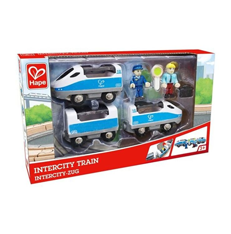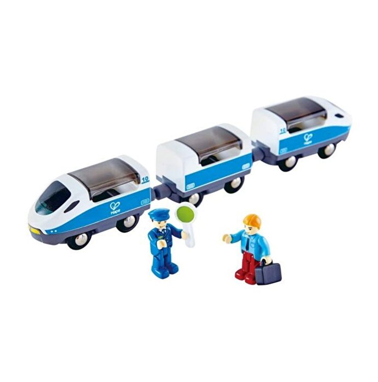 Include tren rapid cu trei vagoane. Figurinele de joaca se pot incadra in vagoane iar setul include un pasager cu geanta si un lucrator feroviar cu semnal. Compatibil cu majoritatea seturilor de cale ferata din lemn.