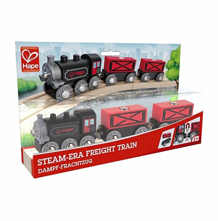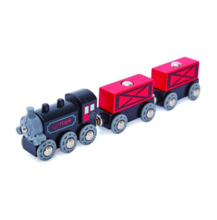Conectati locomotiva la vagoane prin cuplarea magnetilor de pe fiecare unitate. Impingeti trenul de-a lungul pistei. impingeti trenul de-a lungul caii. Tren de marfa clasic din epoca aburului. Include o locomotive si doua vagoane. Magnetii leaga unitatile individuale intr-un tren.