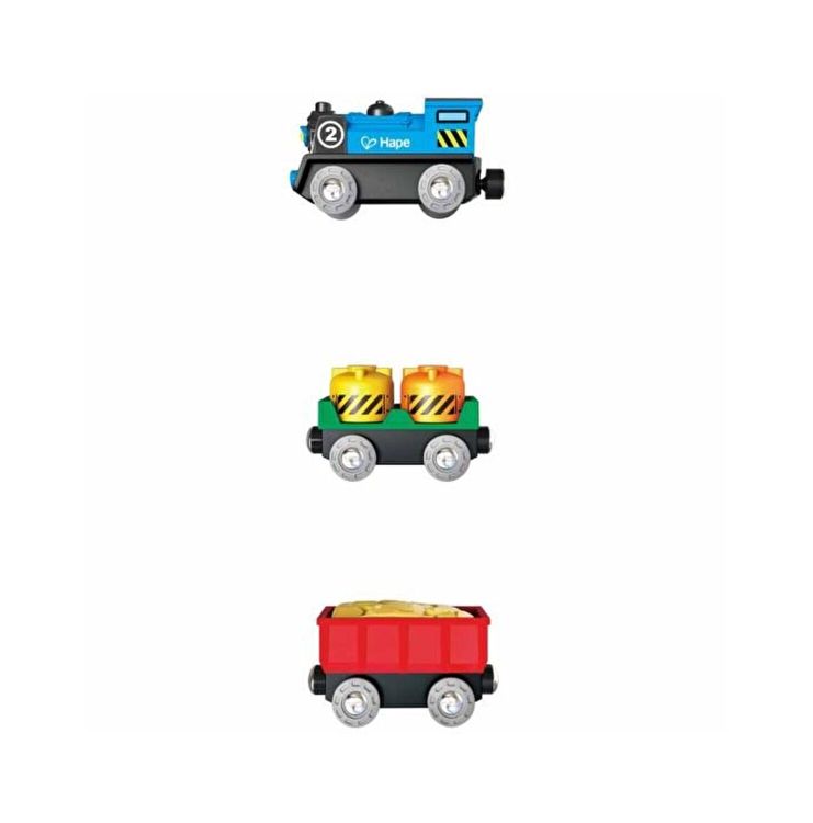 Porniti trenul si puneti-l pe pista. Priveste incarcatura dintr-o masina saltand sus si jos, in timp ce pompele din cealalta masina se invart jur imprejur. Locomotiva alimentata cu baterie cu doua vagoane de marfa.