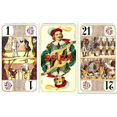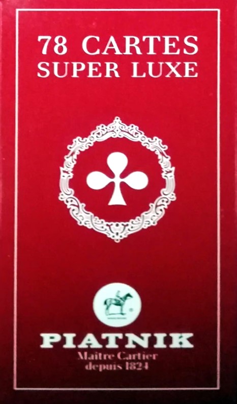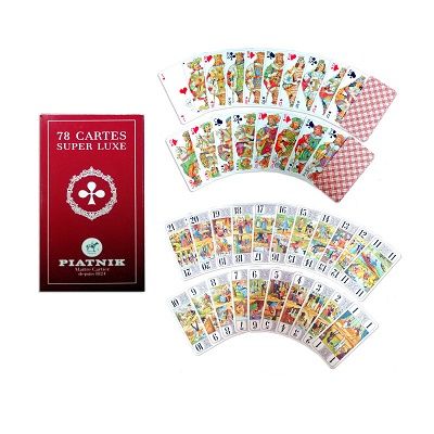 Tarot nu inseamna numai ghicit in carti Tarot este un joc captivant asemanator whist-ului foarte popular in Franta dar si in alte tari europene. Jocul comporta multe combinatii si solutii care trebuie gasite fiind foarte atractiv. Cel mai des se joaca in 4 dar se poate juca si in 2 3 sau 5 jucatori cu anumite modificari. Cartile de joc Tarot Super Luxe se adreseaza celor care vor sa joace Tarot dar o parte din carti isi pastraza valentele pentru ghicit. Cartile sunt in numar de 78 repartizate pe 4 culori plus atuuri 38 de carti sunt cu figuri 21 cu picturi reprezentand scene de viata sociala si restul cu numere. Cartile de Tarot sunt cu o grafica deosebita putand fi folosite si la ghicirea viitorului o alta valenta a Tarotului. Pachetul de Tarot are atasate reguli de joc traduse in limba romana. Cartile de joc sunt de o calitate exceptionala realizate de Piatnik in Austria. Un cadou inspirat pentru pasionatii de jocuri cu carti