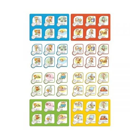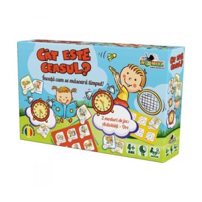 Cat este ceasul este un joc simplu si distractiv care te invata sa citesti ceasul Alege o plansa si completeaza casetele ilustrate de pe ea cu cartonasele potrivite pe care sunt ilustrate aceleasi ore si activitati. Castiga primul jucator care isi completeaza plansa cu cartonasele potrivite Continut 24 de cartonase cu activitati si ore 4 planse cu doua fete activitati si ore .Specificatii