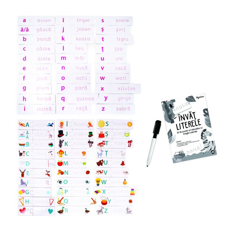 INVAT LITERELE este un joc educativ progresiv, bazat pe corespondenta dintre litere, imagini si cuvinte, de pe cele doua parti ale cartonaselor, pentru a-i invata pe cei mici sa scrie si sa citeasca. Copilul observa cu atentie imaginile, identifica litera de pe piesa de puzzle si incearca sa gaseasca cuvantul corespunzator. Dupa ce uneste toate piesele de puzzle, copilul incearca sa scrie cuvantul de pe fiecare cartonas (cu litere de mari pe fata si cu litere mici pe verso). Astfel, prin joc si exercitii simple, copilul invata foarte usor literele mari si mici ale alfabetului, asociindu-le cu elemente a caror denumire incepe cu literele respective, antrenand scrierea cuvintelor, tinerea corecta a instrumentului de scris, dezvoltandu-si miscarile fine ale mainilor.