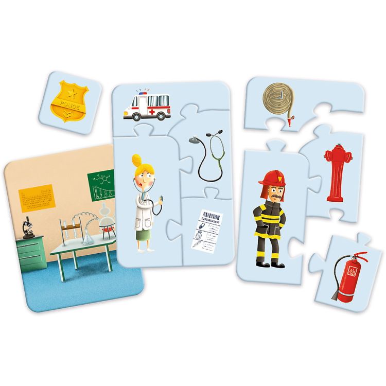 Meserii este un joc de puzzle pentru copiii mici prin intermediul caruia acestia vor ajunge sa cunoasca ce inseamna munca in diferite meserii si care sunt instrumentele necesare pentru o anumita profesie. În timpul jocului, copiii isi imbogatesc vocabularul cu privire la diverse meserii, exerseaza vorbirea pe anumite teme si isi dezvolta curiozitatea cognitiva.
