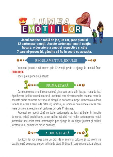 Cele 12 cartonase-emotii contin fiecare o descriere a emotiei respective si cate 7 sarcini-provocari pentru fiecare emotie. Daca ai noroc poti deveni proprietarul emotiei ceea ce iti ofera imunitate si posibilitatea de a da sarcini-provocari celorlalti jucatori pe care ii prinzi in emotia ta . Crezi ca poti depasi toate cele 12 emotii si sa ajungi primul la Fericire Jocul contine o tabla de joc un zar sase pioni si 12 cartonase-emotii. Aceste cartonase-emotii contin fiecare o descriere a emotiei respective si cate 7 sarcini-provocari gandite sa fie in acord cu aceasta.Specificatii