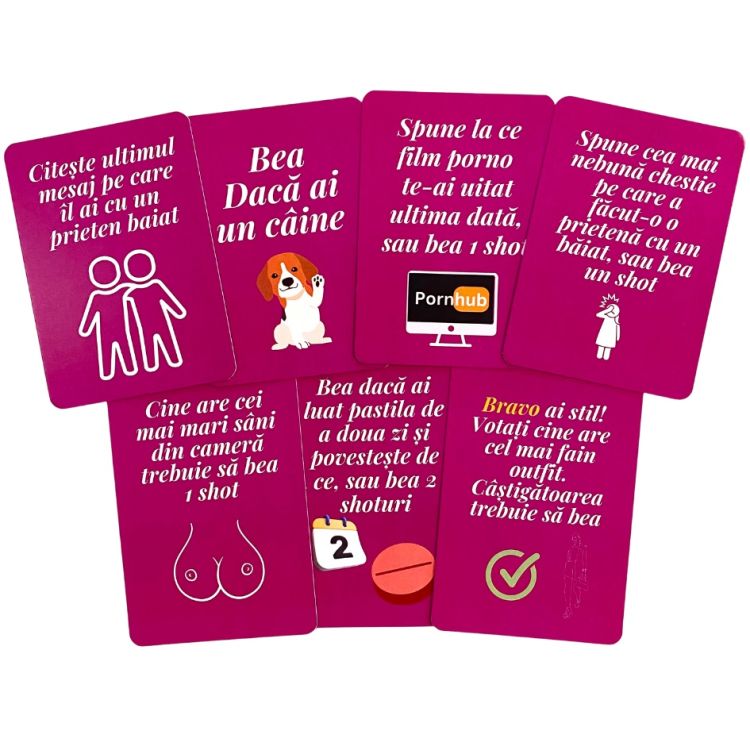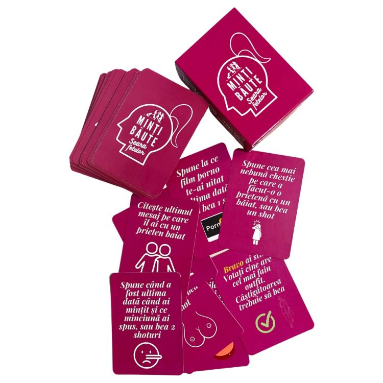 Fie ca urmeaza sa aveti o seara cu fetele sau sarbatoriti petrecerea burlacitelor jocul Minti Baute-Seara fetelor e aici sa va anime Este unicul joc plin de provocari nebune perverse si amuzante cu ajutorul caruia va veti distra cum nu ati facut-o niciodata Acest joc va va face sa impartasiti secrete picante din viata voastra amoroasa si va va face sa uitati de inhibitii. Minti baute va da startul la distractie fetelor Nu uitati ce se intampla la petrecerea burlacitelor ramane la petrecerea burlacitelorSpecificatii