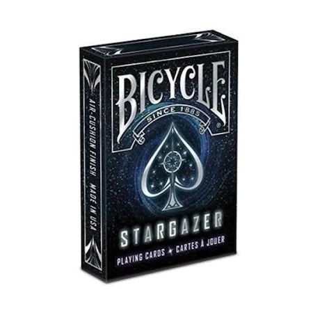 Cartile de joc Bicycle Stargazer au un design inspirat din formarea stelelor in galaxie. Pe versoul cartilor de joc veti vedea acele misterioase si extrordinare obiecte din galaxie numite Gauri Negre locul de nastere al stelelor. Aduceti culorile cosmosului in colectia personala de carti de joc Cutia este deosebit de eleganta avand brandul Bicycle imprimat cu folie argintie. Classic Air-Cushion Finish pentru amestecare usoara si performanta optima. Dimensiuni 88 x 63 mm. Imprimate pe carton premium marca Bicycle si fabricate in SUA. Pot reprezenta un cadou deosebitSpecificatii