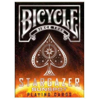Cartile de joc Bicycle Stargazer Sunspot reprezinta spectacolul Soarelui cu nuante rosii portocalii si maronii aplicate pe fundalul cartilor de joc. Pe versoul cartilor de joc veti vedea multitudinea de procese nucleare care dau lumina si caldura singurei noastre stele Soarele. Cutia este deosebit de eleganta cu o stralucire solara. Classic Air-Cushion Finish pentru amestecare usoara si performanta optima. Dimensiuni 88 x 63 mm. Imprimate pe carton premium marca Bicycle si fabricate in SUA. Pot reprezenta un cadou deosebitSpecificatii