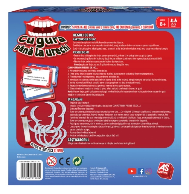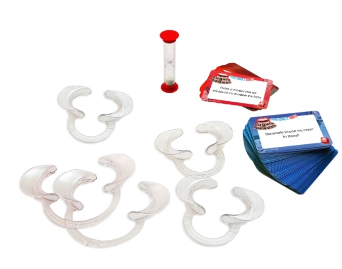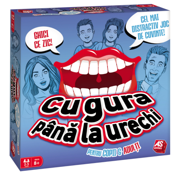 Pregateste-te de super distractie CU GURA PANA LA URECHI - jocul care aduce impreuna parintii si copiii pentru o distractie pe masura. In procesul jocului, jucatorii trag un cartonas si incearca sa rosteasca fraza de pe acesta, avand in gura o piesa bucala ce nu le permite sa-si apropie buzele. Timpul din cronometru se scurge, in timp ce toti jucatorii incearca sa ghiceasca fraza pronuntata. Echipa care aduna cele mai mult cartonase la sfarsitul jocului castiga! Setul contine 5 piese bucale (3 pentru adulti si 2 pentru copii), un cronometru si 100 de cartonase fata verso cu 200 de fraze hilare. Varsta recomandata 8+.
