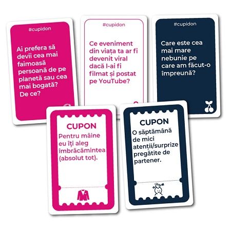 Cupidon este un joc in care cu ajutorul a 180 carti pline de dragoste veti putea descoperi sau redescoperi partenerul partenera indiferent de stadiul in care se afla relatia voastra. Aseaza-te comod trage una dintre carti citeste-o si lasa-te purtat intr-o conversatie palpitanta cu jumatatea ta. Jocul este construit pe 3 etape in functie de stadiul relatiei si pe 5 subiecte diferite. Contine - 180 de carti de joc - regulament in limba romana Varsta recomandata 17 ani Nr. jucatori 2-12Specificatii