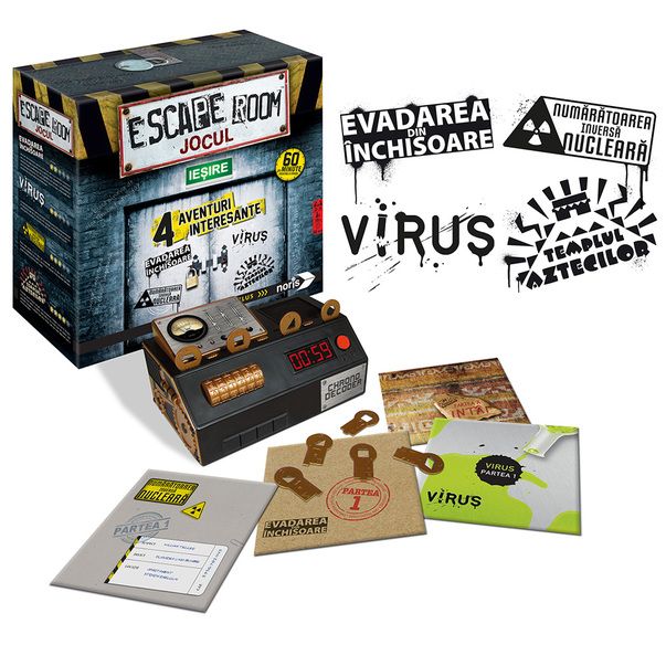Testeaza-ti indemanarea si perspicacitatea, impreuna cu prietenii tai si evadeaza din cele 4 provocari Escape Room. Se poate juca intre 2-5 jucatori.Acceptati provocarea si jucati cel mai in trend joc IEscape RoomI la nivel mondial! Poti sparge codul in 60 de minute? Doar prin munca in echipa aveti sansa de a castiga! Recomandat echipelor de 2-5 jucatori. Jocul include 4 aventuri diferite: evadare din inchisoare, virus, numaratoarea inversa nucleara si templul aztecilor, cu dificultate diferita. Necesita 3 x 1. 5V AA baterii alcaline (nu sunt incluse).