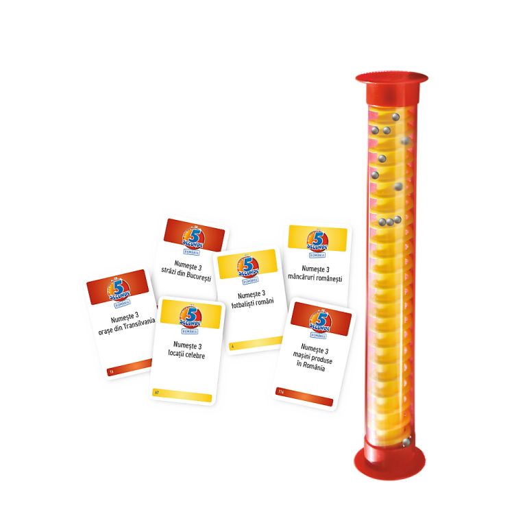 Un joc care te face sa gandesti repede si sa vorbesti repede! Sigur poti sa numesti trei fotbalisti romani diferiti, dar poti face asta contra cronometru? Toate intrebarile sunt despre Romania si despre romani. Ai 5 secunde la dispozitie, deci poti spune orice-ti trece prin cap! Uneori se dau raspunsuri amuzante sau ciudate, iar bilutele aluneca pana la baza tubului pentru masurarea timpului. O varianta compacta a bestsellerului 5 secunde, bazat pe realitatea romaneasca. Perfect pentru orice ocazie! Intrebarile din aceasta varianta pot fi folosite si in jocul 5 secunde clasic. Vor face jocul si mai distractiv.