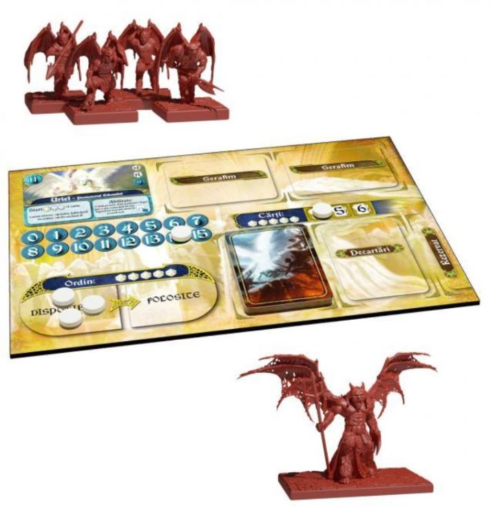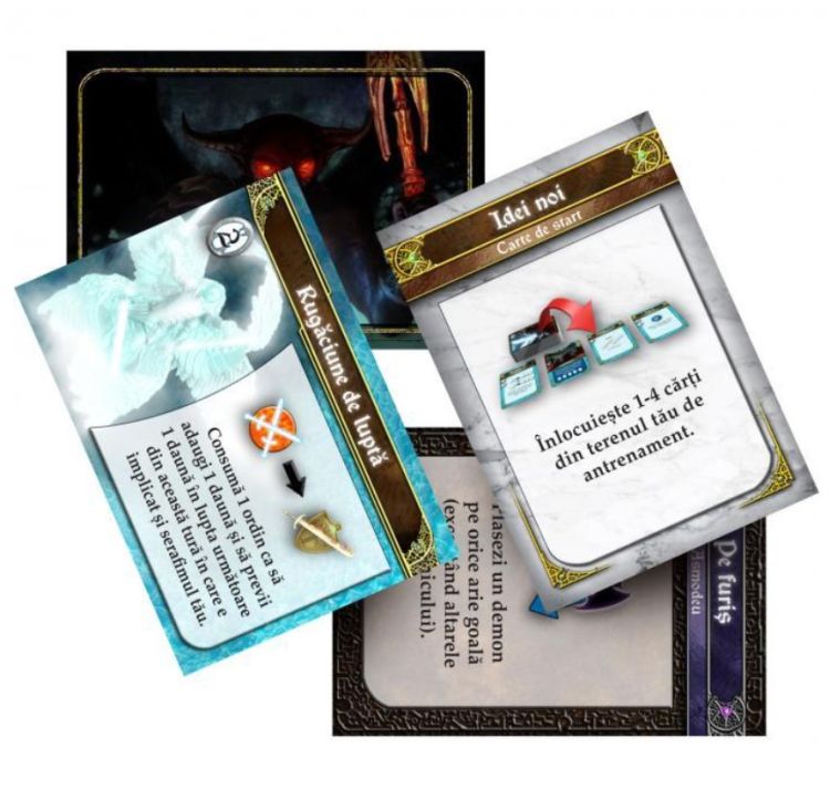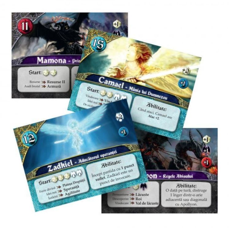 Bun venit in lumea celor nevazuti Armate de ingeri si demoni se confrunta intr-o batalie epica pentru sufletul uman. In timp ce fortele Raiului incerc sa te influenteze in bine cele demonice ale ingerilor decazuti incearca sa atraga sufletul in intuneric si deznadejde. In taramul lumii spirituale puternici luptatori ingeri incearca sa-si mentina pozitia impotriva raidurilor de demoni care incearca sa le sparga defensiva avand ca alternativa preluarea controlului unor cristale valoroase si a unor fantani cu apa vie pe care sa le transforme in izvoare ale raului. Cei mai puternici 6 serafimi sumoneaza ingeri pentru atacul flancurilor inamici intre timp Archangels - mesagerii alesi de Dumnezeu ataca fulgerator pe campul de lupta comandand forte si aducand teama in armatele raului. Archdemons - zei falsi ai lumii stravechi se ridica si ii confrunta in lupta. Toti stiu ca victoria apartine celui mai istet lider. Esti tu acel Lider Preia controlul fortelor binelui sau al hoardelor de diavoli. Fiecare jucator incepe cu un pachet personlizat de un general unic - fie el archangel sau archdemon. La fiecare tura vei utiliza markere Command pentru a muta trupele sau de a initia lupte si apoi vei folosi cartile din mana pentru a face mutari pe campul de lupta sau pentru a construi tura in jurul unei carti epice Tactics care aduce si mai multa valoare Poti folosi resursele pentru a aduce pe plansa de joc mai multe unitati pentru a-ti imbunatati mana de joc sau pentru a aduna mai multe markere Command La sfarsitul turei vei aduna mai multe resurse daca vei controla anumite Areas Zone - sau chiar si 1 Soul Point daca controlezi Human Soul. Fie bun fie rau fiecare are 7 Soul Points - iar jocul se incheie atunci cand toate au fost acumulate de unul dintre cei buni sau rai 1-4 jucatoriSpecificatii