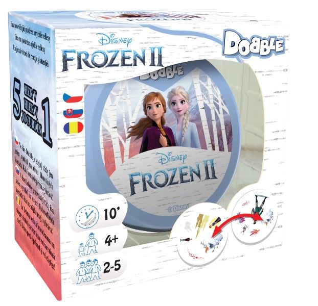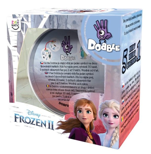Fanii Frozen isi pot recunoaste preferatii cu Dobble cel mai iubit joc de atentie si agilitate Sven Olaf Anna sau Elsa Tu pe cine vei recunoaste cel mai repede Timp de joc 15 minute.Specificatii