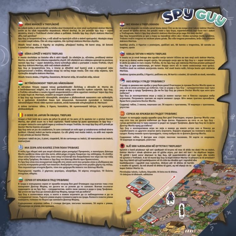 Spy Guy este un joc de detectivi cooperativ in care conteaza un ochi atent si o cooperare stransa intre jucatori. Au fost o serie de furturi in plina zi in Treflikowo Se spune ca vicleanul Doctor Mortiz este in spatele tuturor dar pana acum nu a fost prins. Preia rolul lui Spy Guy un super detectiv care sustine legea si ordinea in oras. Cautati indicii pe o placa imensa de peste un metru si incercati sa-l ajungeti din urma pe raufacator inainte ca acesta sa scape din Treflikowo. Un joc de familie pentru 1-4 jucatori cu varsta peste 5 ani durata medie de joc este de 20 de minute. Jucatorii care participa la o aventura de detectivi practica perceptivitatea si capacitatea de a coopera.Specificatii