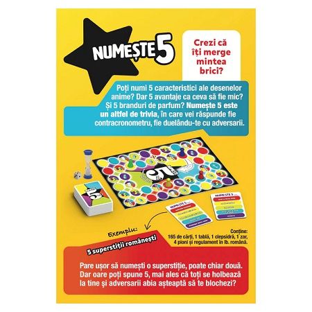 Numeste 5 este un joc de societate distractiv si provocator scopul jocului este sa enumeri cat mai multe elemente care se incadreaza intr-o anumita categorie intr-un timp limitat. Jocul vine cu o tabla de categorii si un cronometru. Fiecare jucator arunca zarul pentru a determina categoria la care trebuie sa raspunda si apoi trebuie sa enumere cat mai multe elemente relevante pentru acea categorie in timpul alocat. De exemplu daca categoria este fructe jucatorii trebuie sa numeasca cat mai multe fructe posibile inainte ca timpul sa se scurga. Numeste 5 este un joc potrivit pentru grupuri mari de prieteni sau familii si poate crea o atmosfera plina de rasete si competitie amicala. Este un joc care testeaza rapiditatea de gandire cunostintele generale si abilitatile de asociere rapida a ideilor. Cu reguli simple si o varietate de categorii Numeste 5 este un joc captivant care poate fi jucat oriunde si oricand aducand bucurie si provocare in timpul petrecut cu cei dragi. Contine 165 carti de provocare 1 tabla 1 zar 4 pioni 1 clepsidra de 30 secunde regulament in limba romana. Varsta recomandata 14 ani Nr. jucatori 2-12 jucatoriSpecificatii