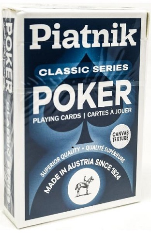 52 de carti plus 3 jokeri poker size un pachet cu model albastru pe spate Cartile de joc sunt din carton plastifiat placute la atingere si in acealasi timp rezistente in timp. Finisajul este deosebit de tip batista care asigura o alunecare excelenta a cartilor de joc atunci cand sunt amestecate sau impartite. Cu aceste carti de joc clasice se poate juca orice joc Poker Canasta Bridge Whist Rent etc. Cartile sunt din carton plastifiat placute la atingere si in acealasi timp rezistente in timp. Dimensiuni poker size 88 x 63 mm. Un raport calitate pret imbatabil.Specificatii