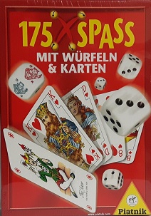 Set pentru jocuri de societate Piatnik cu 2 pachete de carti de joc cupa cu 5 zaruri normale si 5 zaruri de poker Setul pentru jocuri de societate Piatnik numit 175 Spass adica 175 de distractii cuprinde toate accesoriile necesare pentru orice joc cu carti sau cu zaruri. In cutia setului veti gasi urmatoarele Doua pachete cu 55 de carti de joc fiecare 52 de carti normale 3 Jokeri . Cele 2 pachete au carti de joc sunt confectionate din carton plastifiat de calitate au figuri foarte frumoase si sunt produse la Viena. Cu ele puteti juca orice joc cu carti precum Canasta Poker Whist Bridge Rentz etc Un set de 5 zaruri normale frumos finisate cu colturi rotunjite si diametrul de 16 mm Un set de 5 zaruri cu figuri de poker frumos finisate cu colturi rotunjite si diametrul de 16 mm O cupa din material plastic rezistent pentru aruncat zarurile. Un carnetel de notat scorul la jocuri. Instructiuni de joc in limba romana pentru mai multe jocuri cu carti si cu zaruri. Acest set elegant poate constitui un cadou inspirat pentru orice persoana care apreciaza jocurile cu carti si sau cu zaruri. Recomandat pentru jucatori de peste 18 ani. Numar de jucatori 2-6Specificatii