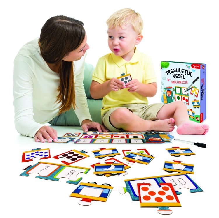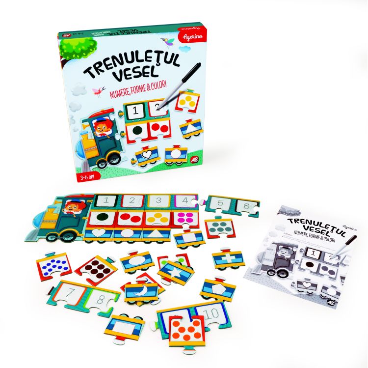 Trenuletul vesel: Numere, Forme siCulori este un joc educativ progresiv care vine sa-l ajute pe copil sa invete numerele si cantitatile, sa deseneze numerele si formele, invatand simultan culorile de baza. Copilul gaseste mai intai piesele cu numere conectandu-le la locomotiva trenului, apoi, recunoaste numarul si incearca sa gaseasca cantitatea corecta, adaugand a doua piesa cu puncte colorate. In cele din urma, conform culorii punctelor, copilul incearca sa gaseasca forma corecta care are conturul de aceeasi culoare. Continut: 5 cartonase cu numere, 10 piese de puzzle cu cantitati si culori si 10 piese de puzzle cu forme, 1 manual si 1 marker lavabil. Varsta recomandata 3-6 ani. Valori dezvoltatea - abilitati cognitive, miscarile fine ale mainilor, memoria, autonomia.