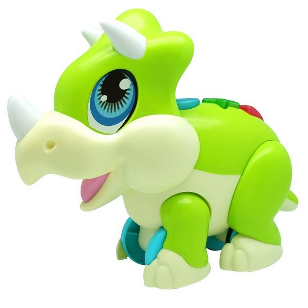 Faceti cunostinta cu noul dinozaur interactiv Triceratops cu lumini si sunete care atrage atentia fiecarui copil. Efectele sonore sunt declansate imediat ce apasati butonul de pe spatele dinozaurului. Acesta ii va surprinde pe cei mici prin sunetele sale sforait mestecat si mers. Megasaur Triceratops Junior ii va incanta pe toti micii aventurieri care vor sa arunce o privire in lumea misterioasa a dinozaurilor.Specificatii