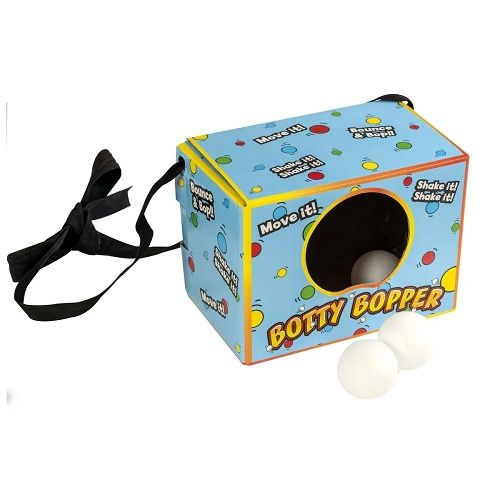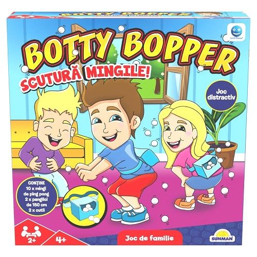 Esti gata sa te distrezi cu Botty Bopper Baga-ti mingile de ping-pong in cutie leaga-ti cutia in jurul taliei si incepe sa dansezi Primul care reuseste sa goleasca geanta de bile castiga jocul Cu acest joc copiii isi vor dezvolta abilitatile de dans si vor avea ocazia de a socializa cu prietenii lor. Pachetul contine - 10 x mingi de ping-pong - 2 x panglici de 150 cm - 2 x cutii.Specificatii
