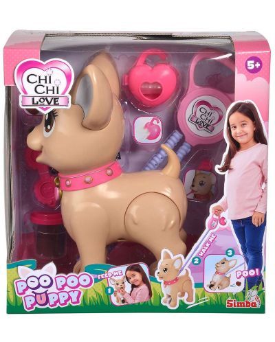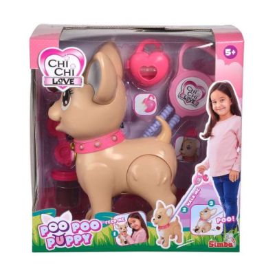 Catelusul Poo Poo este aici sa te distreze. Hraneste-l cu plastelina care este inclusa in set iar dupa masa scoate-l la o plimbare. La un moment dat in timpul plimbarii Poo Poo isi va face nevoile. Foloseste punga inclusa in set pentru a strange plastelina. Cu catelusul Chi Chi Love Poo Poo copiii de la varsta de trei ani pot merge pe jos si sa isi asume sarcinile tipice ale unui proprietar de caine. Prajiturile din plastilina ca recompensa nu lipsesc din nicio plimbare cu acest catelus da-i catelusului si apasand putin lesa picioarele din spate ale Chi Chi Love se apleaca inainte si micul chihuahua isi face nevoile ca in viata reala. O alta obligatie a proprietarului de caine este sa foloseasca pliculete pentru a curata dupa catel cureaua poarta o cutie cu inimi care contine cinci pungi astfel incat copiii sunt echipati optim pentru runda zilnica de plimbari.Specificatii