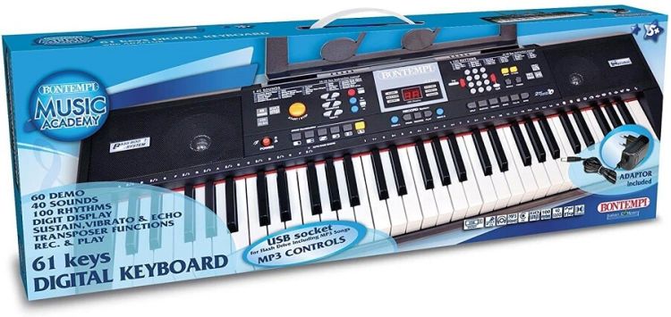 Fiecare copil isi poate demonstra perfect abilitatile muzicale pe aceasta orga de la Bontempi 61 taste cu latime completa. 40 de sunete. Polifonie in 8 tonuri. 100 de ritmuri cu acorduri de aranjare si usor de gestionat. 60 de melodii preinregistrate. Afisaj pentru vizualizarea functiilor curente. Sequencer pentru a inregistra si a asculta continutul redat. Transpozitor pentru a schimba tonul. Efecte Reverb Sustain Echo. Comenzi Volum general Start Stop Tempo - Fill Sync Split. Tambur manual. Cititi melodii MP3 continute pe o unitate flash USB. Volum si control secvential al pieselor MP3. Priza adaptor CA inclusa . Priza pentru casti sau Hi-Fi. Priza USB pentru unitate flash. Mufa microfon condensator nu este inclusa . Amplificare Stereo. Alimentare 6 baterii R6 AA 1 5V nu sunt incluse . Este inclus un suport pentru muzica. Dimensiuni 860x295x90 mm. Atentie Contraindicat copiilor mai mici de 3 ani. Jucaria produsul poate contine piese mici care se pot inghiti sau inhala existand pericolul de sufocare. Nu lasati ambalajele jucariilor produselor la indemana copiilor. Indepartati orice ambalaj al jucariei produsului inainte de a da jucaria produsul copilului. Va rugam sa supravegheati copilul in timp ce se joaca foloseste acest produs. Pastrati instructiunile si etichetele pentru referinte viitoare. Pastrati jucaria produsul departe de foc feriti jucaria produsul de temperaturi ridicate si umiditate.Specificatii