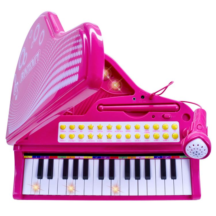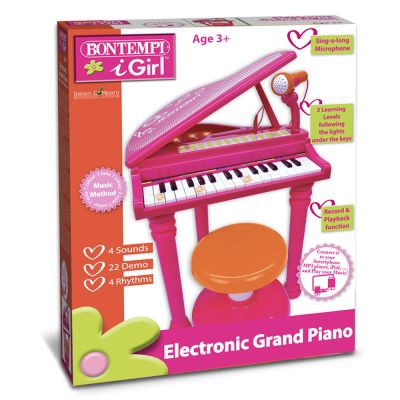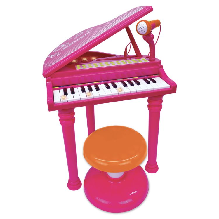 Bontempi Pian electronic pentru copii cu scaun si microfon roz. Pianul electronic fluorescent pentru copii cu microfon si scaun va va ajuta sa descoperiti sunete, stiluri muzicale si cantece. Pianul are 31 de clape, efecte luminoase. Pianul electronic vine predefintit cu 4 sunete, 4 ritmuri si 22 de piese demonstartive. 4 pad-uri pentru tobe. Microfon reglabil. Puteti inregistra si reda melodii. 3 niveluri de invatare prin lumini cheie. 3 picioare. Acoperire cu suport de sprijin. Reglati volumul si tempo-ul. Oprire automata. Conexiune priza la player MP3 (cablu inclus). Alimentare 4 baterii R6 / AA 1. 5V (nu sunt incluse). Beneficiile acestui instrument sunt familiarizarea cu muzica si ritmul, dezvoltarea abilitatilor sociale si cognitive, coordonarea miscarilor, atentia distributiva.