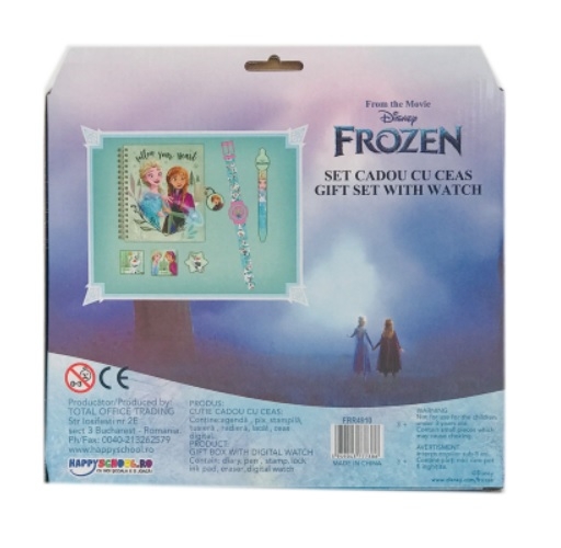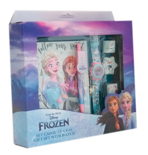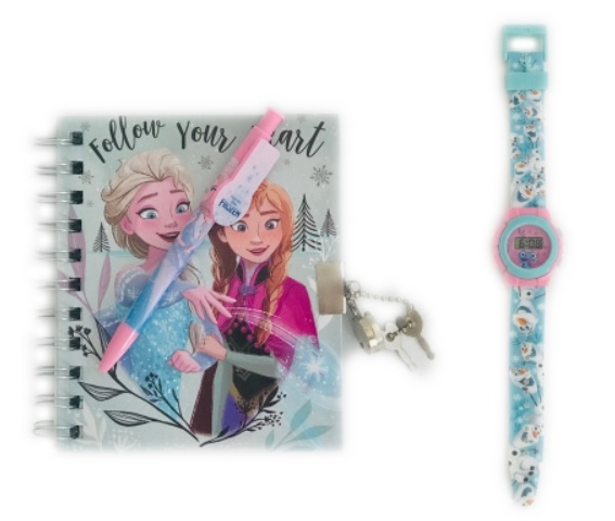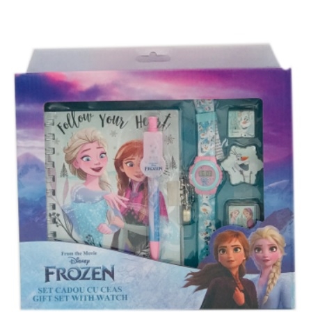 Set cadou Frozen format din agenda cu lacat si chei, stampila si tusiera, radiera, pix cu mascota si ceas digital.