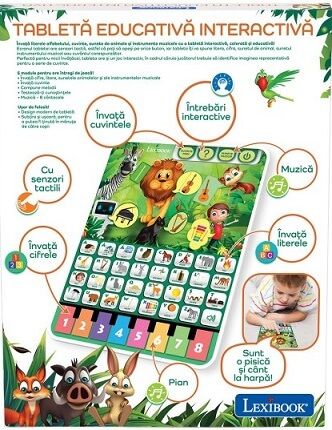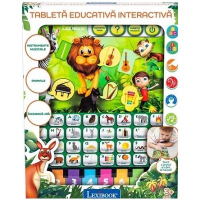 Invata literele alfabetului cuvinte sunete de animale si instrumente muzicale cu o tableta interactiva colorata si educativa Ecranul tabletei are senzori tactili astfel ca poti sa apesi pe orice buton iar tableta iti va spune litera cifra sunetul de animal sunetul instrumentului muzical sau cuvantul corespunzator Perfecta pentru micii invattacei tableta are si un joc interactiv in cadrul caruia jucatorul trebuie sa identifice imaginea reprezentativa pentru o serie de cuvinte 5 Module pentru ore intregi de joaca - invata cifre litere sunetele animalelor si ale instrumentelor muzicale - invata cuvinte - compune melodii - testeaza-ti cunostintele - muzica - 8 cantecele Usor de folosit - Design modern de tableta - Subtire si usoara pentru a putea fi tinuta in manute de catre copii Produsul functioneaza cu 3 baterii AAA de 1. 5V Incluse Varsta 3 aniSpecificatii