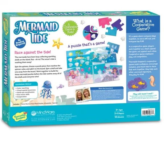 Roteste spinner-ul, alege o piesa de puzzle care se potriveste culorii indicate de spinner si adauga-o pe tabla. Daca spinner-ul indica o scoica, ia una si plaseaz-o pe tabla. Lucrati impreuna si toata lumea castiga!