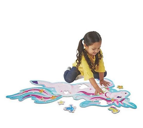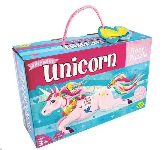Un puzzle adorabil de podea, in forma de unicorn, cu accente stralucitoare! Piesele de puzzle sunt groase si rezistente, include forme unice precum un fluture, o stea etc.