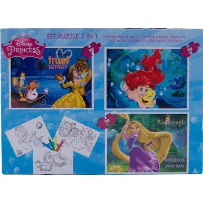 Setul contine - 3 puzzle-uri cu 48 54 si 70 piese - 3 foi A4 preconturate - 4 creioane colorate. 3 aniSpecificatii
