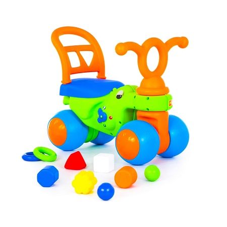 Plimbarile cu ajutorul vehiculelor fara pedale reprezinta una dintre principalele activitati pe care cei mici le indragesc. Caracteristici - Bicicleta este confectionata din material plastic de calitate viu colorat. - Vehiculul fara pedale va dezvolta musculara si coordonarea celor mici pentru deplasare copii trebuind sa impinga cu picioarele in pamant si sa rasuceasca volanul avand control deplin al directiei. - Bicicleta este echipata cu patru roti late sferice din plastic si un spatar inalt care permite copilului sa se deplaseze in siguranta impingand cu picioarele. - Cadrul bicicletei are forma de crocodil. - Sub scaun exista un loc pentru depozitarea celor 9 forme geometrice incluse in set 2 sfere 2 inele 1 cub 1 piramida 1 cilindru 1 prisma octagonala 1 floare. - Corpul bicicletei are doua gauri speciale prin cea de sus se introduc formele geometrice iar prin cea de jos se pot scoate. Decupajul de jos are capac. - De asemenea pe cadrul bicicletei este un cadran cu ace indicatoare care pot fi rasucite cu mana. - Volanul are rasucire limitata pentru ca cei mici sa-si pastreze echilibrul. - Jucaria este ambalata in cutie din carton. Dimensiune bicicleta 47x27x43 cm Inaltime pana la scaun 25 cm Inaltime pana la ghidon 40 cm Diametru roti 13 cm Latime roti totala 11 cm partea albastra 9. 5 cm Avertizare Produsul este nou si comercializat in ambalajul original al producatorului. Imaginile de pe acest site au caracter informativ. Produsul nu functioneaza cu baterii. Ambalajul trebuie indepartat recuperat si aruncat de catre un adult inainte de a se da spre utilizare copilului. Nu lasati ambalajele produselor la indemana copiilor. Se recomanda utilizarea produsului sub supravegherea unui adult. Produsul poate contine piese mici care se pot inghiti sau inhala de cei mici existand pericolul de sufocare sau nu este potrivita copiilor mai mici de 3 ani. Pastrati instructiunile si etichetele pentru referinte viitoare. Pastrati produsul departe de foc si nu il lasati in preajma temperaturilor ridicate si a umiditatii. Datorita masurarii manuale a produsului poate exista o diferenta minora fata de dimensiunea reala a produsului.Specificatii