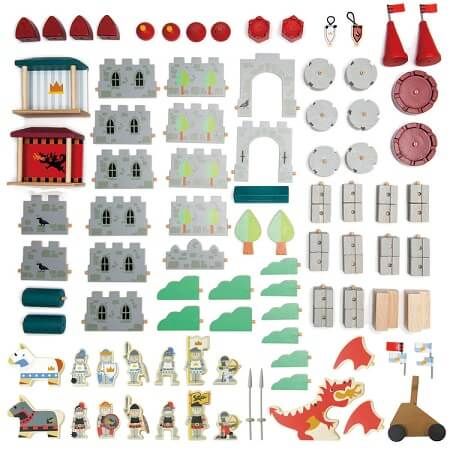 Fii regele Castelului Regal Acest set de lux de dimensiuni mari are toate elementele de cladire pentru construirea castelului prin prinderea peretilor si ale stalpilor cu mici carlige din plastic si include cavalerii neinfricati arcasii calareti luptatori corturi cu stema familiilor masina de asediu catapulta si desigur nu poate lipsi nici dragonul rosu fantoma fiecarei fortificatii. Urmareste cresterea imaginatiei copilului si deschide-i mintea cu castelul din lemn construind castelul din piese. Cadoul perfect pentru stimularea creativitatii copilului tau. Acesta este cadoul perfect pentru ziua de nastere Craciun sau sarbatori Prin construirea acestui fantastic castel din lemn copii isi dezvolta abilitatea de a rezolva problemele. Diferitele modalitati de combinare a pieselor imbinat cu un joc de rol vor ajuta la dezvoltarea abilitatilor de coordonare maini-ochi a abilitatilor spatiale si a gandirii libere in timp ce se distreaza. Perfect pentru a va juca sau a adauga la Castelul Lupilor si Castelul Dragonului din gama Tender Leaf Toys. Contine 100 piese echipamente si accesorii complete. Situatiile din viata reala ii inspira pe copii sa gandeasca creativ in timpul copilariei si ii determina sa interactioneze mai usor cu ceilalti in acelasi timp construind incredere si prietenie. De asemenea le consolideaza limbajul emotiile si abilitatile motrice fine. O metoda buna de dezvoltare a procesului de gandire - Copiii vor invata sa gandeasca pas cu pas si sa cultive bune obiceiuri organizationale in timp ce indeplinesc sarcini. Incurajeaza interactiunea cu parintii si fratii pentru a rezolva problemele si a-si indeplini obiectivele. Recomandat copiilor cu varsta de peste 3 ani. Jocurile premium creeaza un mediu de joc natural - Tender Leaf Toys foloseste cunostintele si creativitatea pentru a aduce energie si emotie jucariilor realizate din lemn premium. Din dorinta de a proteja pamantul folosesc doar lemn ecologic. Realizat dintr-o resursa regenerabila - Va doriti ce-i mai bun pentru copilul dumneavoastra si aceasta jucarie chiar acest lucru livreaza. Fabricat din lemn de arbore din cauciuc regenerabil aceasta este o jucarie ecologica si sigura care nu contine substante chimice iar pentru fiecare copac care devine o jucarie frumoasa un altul este replantat. Vopseaua folosita este pe baza de apa non-toxica pentru a pastra copii in siguranta. Indeplineste toate standardele de siguranta si calitate europene - Calitatea si siguranta sunt cele mai importante parti ale proiectelor de la Tender Leaf Toys. Fiecare jucarie este facuta cu grija pentru bunastarea si educatia copiilor. Proiectat de echipa TLT din Marea Britanie pentru a satisface toate standardele europene. Fabricat in fabrica TLT din Indonezia. Despre Tender Leaf Toys creeaza jucarii netede frumos proiectate care promoveaza invatarea prin joc. Traditionali in conceptie dar contemporani in design toate produsele sunt realizate cu un accent distinct pe mestesug si calitate.Specificatii