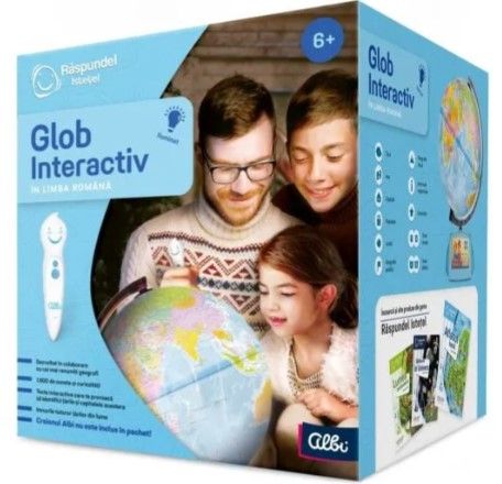 Cea mai recent versiune a Globului interactiv din colec ia Raspundel Istetel are un suport mai stabil i culori mai luminoase. Globul 4. 0 func ioneaz cu creionul Albi cu ajutorul c ruia pute i interac iona cu globul i pute i afla informa ii utile i interesante despre aproape 200 de ri din lume. Ve i descoperi fapte importante despre acestea capitale informa ii despre popula ie i geografie politic . n plus pute i asculta imnurile tuturor statelor i multe alte informa ii. Nu lipsesc jocurile distractive i chestionarele cu dou niveluri de dificultate care v vor testa cuno tin ele acumulate. Globul interactiv a fost dezvoltat n colaborare cu exper i n domeniul geografiei. Astfel datele folosite pentru glob sunt precise i actualizate. Care este diferen a dintre noul i vechiul Glob Noul Glob 4. 0 are o baz stabil de culoare albastr n compara ie cu versiunile anterioare. Icoanele de control sunt imprimate direct pe baza globului nu pe o cartel de inser ie i suprafa a globului are culori mai clare i mai intense. Fi ierul audio nu se schimb valoarea educa ionala a produsului r m ne aceea i. Globul con ine peste 1800 de sunete i texte. Acest produs func ioneaz doar cu Creionul electronic interactiv Raspundel Istetel care nu este inclus Se poate achizi iona separat sau n pachetele carte i creion Raspundel Istetel. Aten ie Contraindicat copiilor mai mici de 3 ani. Juc ria produsul poate con ine piese mici care se pot nghi i sau inhal exist nd pericolul de sufocare. Nu l sa i ambalajele juc riilor produselor la ndem n copiilor. ndep rta i orice ambalaj al juc riei produsului nainte de a da juc ria produsul copilului. V rug m s supraveghea i copilul n timp ce se joac folose te acest produs. P stra i instruc iunile i etichetele pentru referin e viitoare. P stra i juc ria produsul departe de foc feri i juc ria produsul de temperaturi ridicate i umiditate.Specificatii