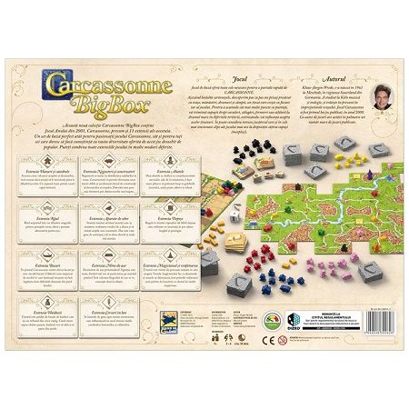 Carcassonne Big Box - Lansat in anul 2000 Carcassonne a castigat rapid aprecierea criticilor primind in 2001 distinctia de Jocul Anului. De-a lungul timpului Carcassonne a cucerit un numar tot mai mare de jucatori prin stilul captivant varietatea in continua crestere prin extensiile sale si regulile simple de joc. Carcassonne Big Box combina jocul de baza cu unsprezece extensii Raul Abatele Hanuri si catedrale Negustori si constructori Aparate de zbor Depese Bacuri Minele de aur Magicianul si vrajitoarea Haiducii Cercuri in lan devenind astfel setul perfect de start pentru cei care vor sa incerce jocul cu un maxim de varietate. In Carcassonne Big Box veti descoperi peste 150 de cartonase de joc si sapte tipuri diferite de meeplesi figuri speciale de joc Jocul de baza ofera o experienta unica la fiecare partida jucatorii plaseaza cartonase de teren intr-un spatiu comun de joc si construiesc treptat un teritoriu variat. Punctele se obtin prin finalizarea celor mai multe si mai mari orase celor mai intinse drumuri si celor mai vaste campii. Extensiile din colectia Carcassonne Big Box pot fi adaugate jocului de baza in orice combinatie dorita. Fiecare aduce cate o particularitate ce rezulta in rasturnari de situatie inedite si care duc jocul in directii noi. Intr-o partida meeplesii tai pot construi catedrale impunatoare pentru a adauga valoare oraselor tale in alta ei se pot inalta in vazduh si pot ateriza in tinuturi noi neexplorate sau de ce nu le pot face pe amandoua. Indiferent cu ce extensii alegi sa joci vei descoperi de fiecare data strategii noi de incercat si secrete noi de descoperit. Cu atat de multe optiuni incluse te invitam sa iei loc la masa de joc si sa explorezi tot ce are de oferit aceasta colectie bogata. Continut jocul de baza Carcassonne 80 de cartonase de teren 48 de meeplesi extensia Raul 12 cartonase de teren extensia Abatele 6 meeplesi abate extensia Hanuri si Catedrale 18 cartonase de teren 6 meeplesi mari extensia Negustori si Constructori 24 de cartonase de teren 6 constructori 6 porci 20 de jetoane cu marfuri 7 extensii exclusive Aparatele de zbor 8 cartonase de teren 1 zar special Depese 8 cartonase cu depese 6 mesagere Bacuri 8 cartonase de teren 8 bacuri din lemn Minele de aur 8 cartonase de teren 16 lingouri din lemn 1 cartonas de evaluare Magicianul si vrajitoarea 8 cartonase de teren 1 magician 1 vrajitoare Haiducii 8 cartonase de teren 6 pioni haiduci Cercuri in lan 6 cartonase de teren Varsta recomandata 7 ani Nr. jucatori 2-6. Durata cca. 35 min.Specificatii