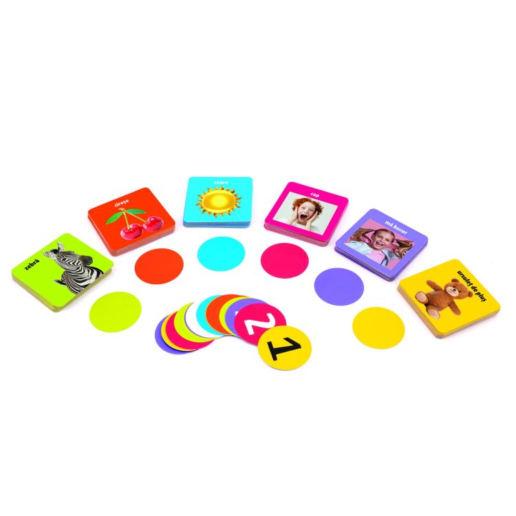 101 de cuvinte din viata cotidiana", ajuta copilul sa recunoasca obiectele si culorile, invatand in acelasi timp sa numere. Trageti un jeton si observati-l impreuna cu copilul. Ajutati-l sa gasesca si sa adune numarul corespunzator de cartonase de culoarea indicata pe jeton. Cititi cu voce tare denumirile imaginilor pentru ca copilul sa poata memoriza obiectele, culorile si numerele. Jocul include 3 modalitati de joc: "Gaseste si priveste", "Cine stie castiga" si "Ce sunt?". Valori dezvoltate: perceptia vizuala, relationarea imaginilor si cuvintelor, abilitatile motorii, logica, spiritul de observatie. Jocul contine 50 de cartonase fata verso si 27 de jentoane. Jocul nu necesita abilitati de citire. Jucatori 1-4. Varsta recomandata 2+.