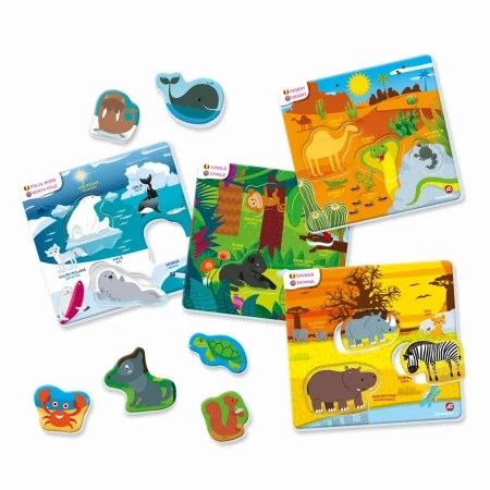 Habitatul Animalutelor este un joc educativ simplu si distractiv pentru copiii de la 3 ani. Contine cartonase colorate cu notiuni in romana si engleza pentru a facilitate invatarea denumirilor animalelor si habitatelor in 2 limbi. Aratati-i copilului o plansa cu un habitat. Descoperiti impreuna caracteristicile acestuia si animalele specifice. Prin joc copilul invata habitate precum Padurea Savana Polul Nord si Ferma etc. Jocul contine 6 planse mari cu habitatul animalelor si 18 piese de puzzle cu animalute. Valori dezvoltate logica cunostinte despre lume autonomia sociabilitatea memoria limba straina aptitudinile motorii. Toate jocurile lui Agerino au fost concepute de specialisti in pedagogie si psihologie si au fost testate in scoli. Varsta recomandata 3 .Specificatii