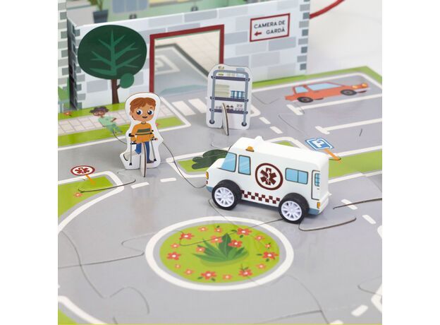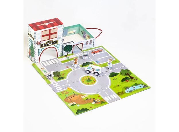 Invata in timp ce te joci Foloseste cutia puzzle-ul si si trenul pentru a crea nenumaratate oportunitati de a te juca si a invata. SETUL CONTINE O carte cartonata si ilustrata de 16 pagini din care poti afla totul despre trenuri si despre ce se intampla intr-o statie de tren. Un tren confectionat din lemn. 4 figurine din carton. O cutie care se poate transforma intr-o statie de tren. Un puzzle format din 16 piese cartonate cu ajutorul carora poti recrea orasul din jurul garii. Un joc de potrivire pentru care se foloseste partea din spate a pieselor de puzzle.Specificatii