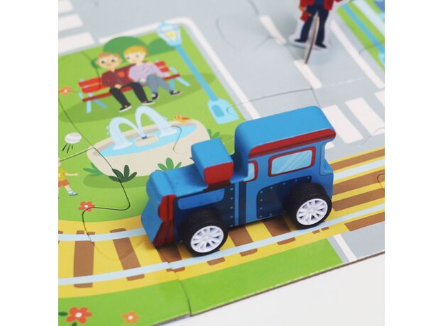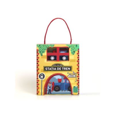 Invata in timp ce te joci Foloseste cutia puzzle-ul si si trenul pentru a crea nenumaratate oportunitati de a te juca si a invata. SETUL CONTINE O carte cartonata si ilustrata de 16 pagini din care poti afla totul despre trenuri si despre ce se intampla intr-o statie de tren. Un tren confectionat din lemn. 4 figurine din carton. O cutie care se poate transforma intr-o statie de tren. Un puzzle format din 16 piese cartonate cu ajutorul carora poti recrea orasul din jurul garii. Un joc de potrivire pentru care se foloseste partea din spate a pieselor de puzzle.Specificatii